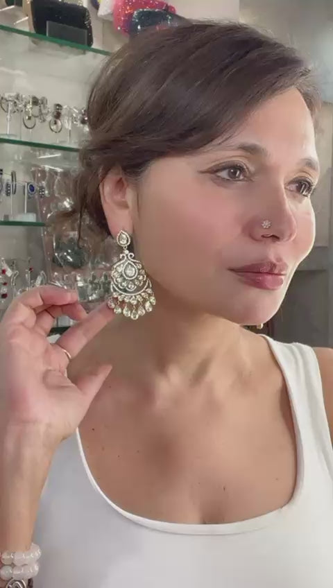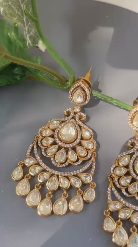 Stunning chandbali earrings featuring layered teardrop mossanite polki stones, accentuated with delicate crystal outlines and hanging drops for an elegant...