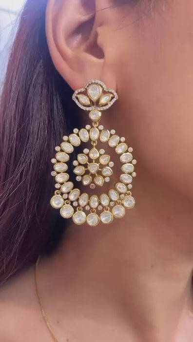 Elegant circular earrings embellished with uncut mossanite polki stones in a layered floral pattern, finished with delicate oval drops for...