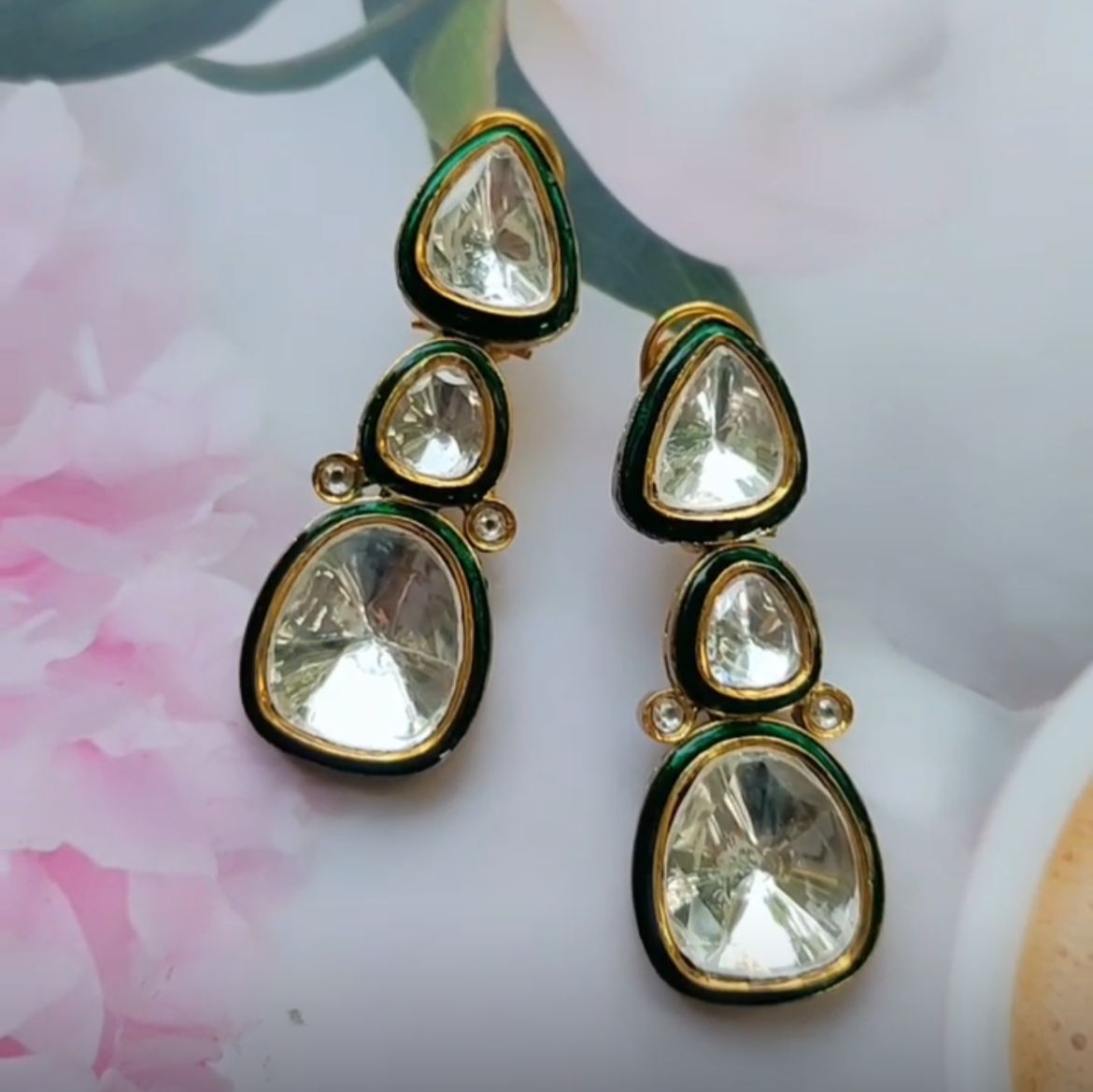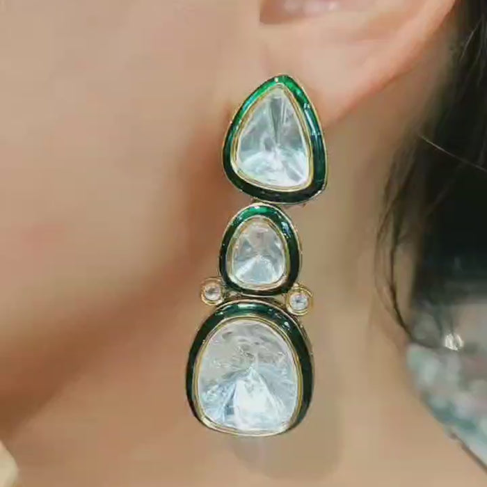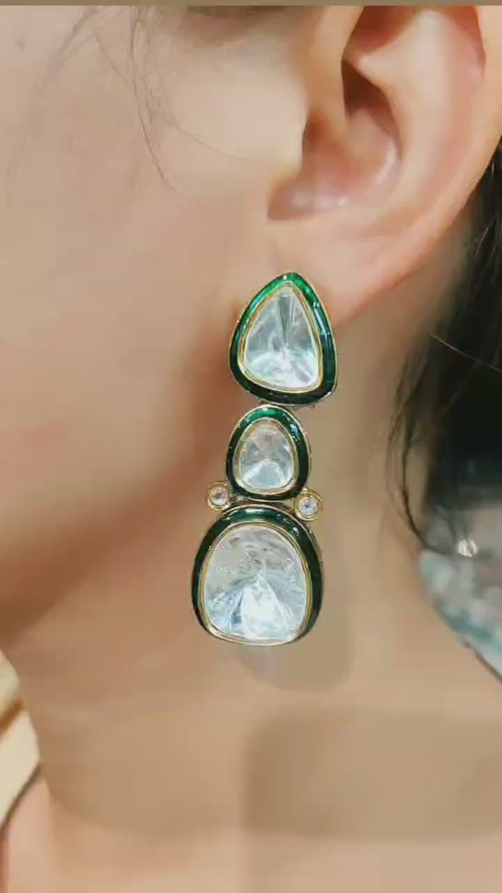 These are elegant kundan-style drop earrings featuring three clear, uncut polki stones in descending size, set in gold-toned frames with...