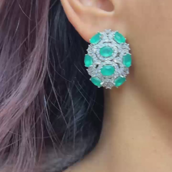 These are highly dimensional, domed stud earrings with an oval shape. The surface is completely covered in gemstones, forming a...