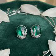 Elegant oval cabochon stone earrings framed with delicate leaf-inspired accents, highlighted by fine shimmering stones for a graceful, nature-inspired look....