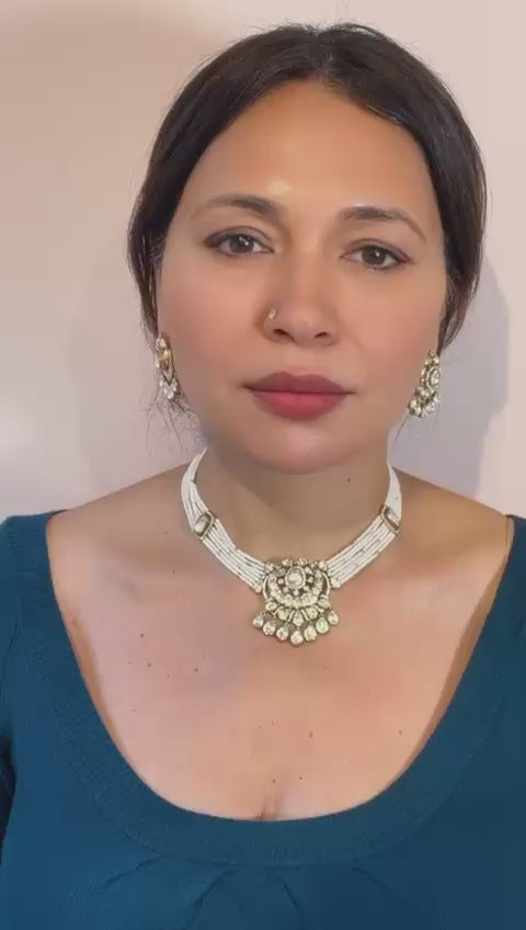 A regal beaded necklace with a crescent-style pendant and elegant drop details, paired with matching earrings