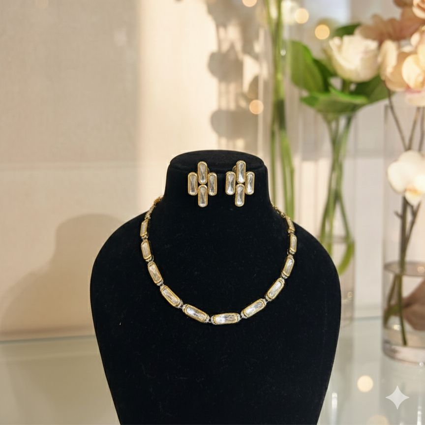 Elegant moissanite polki necklace set featuring elongated, uncut-style stones in a classic gold-tone setting, paired with matching statement earrings for...