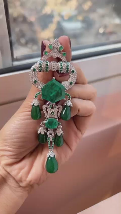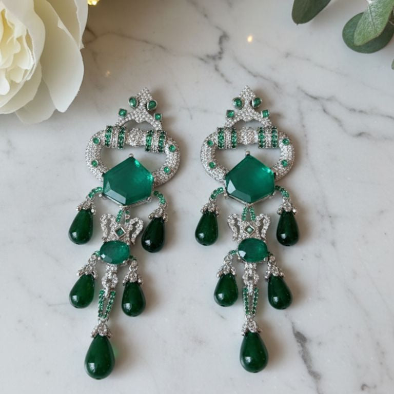 Statement chandelier earrings with a geometric centerpiece, sparkling accents, and graceful drop elements, designed to create a bold yet elegant...