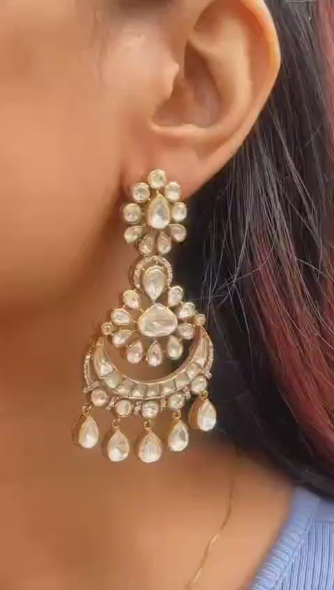 Graceful earrings adorned with layered teardrop mossanite polki stones and delicate hanging drops, showcasing timeless elegance and traditional artistry.
