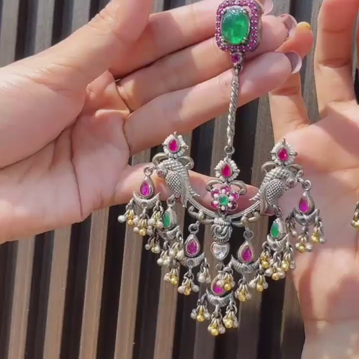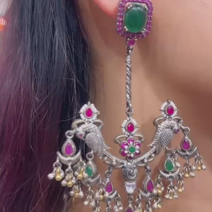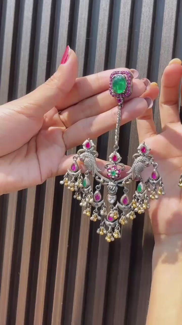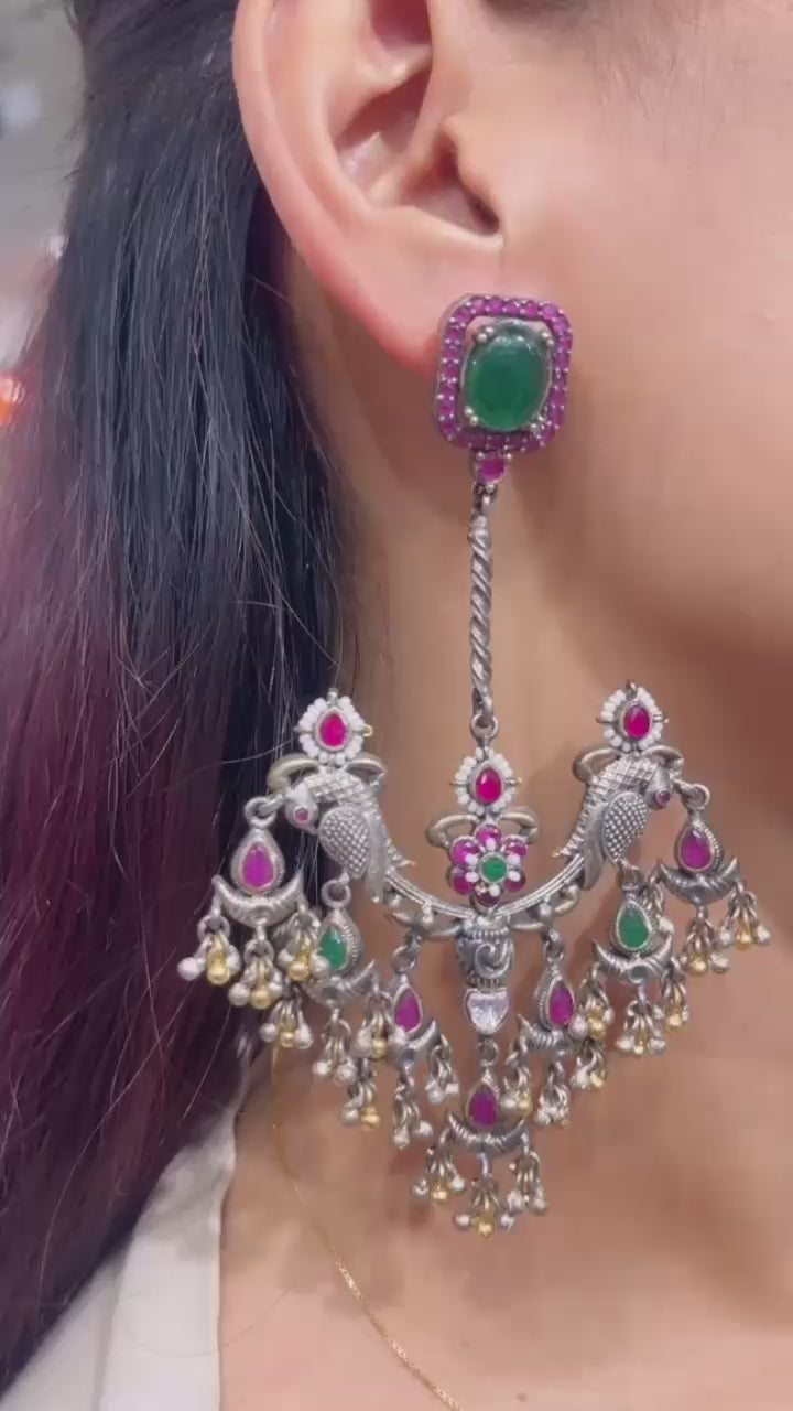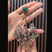 A large cabochon stone at the stud, bordered with smaller stones. Intricate twin peacock motifs in the center with floral...